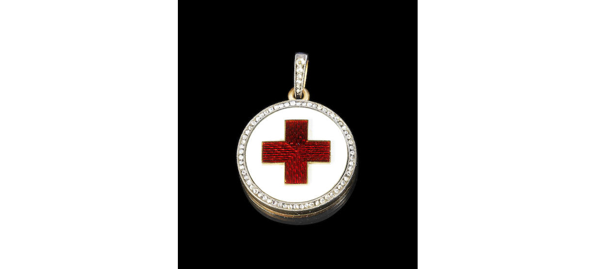 the circular façade enamelled white within rose-cut diamond border with Red Cross insignia to centre, opening at hinge to reveal double frame