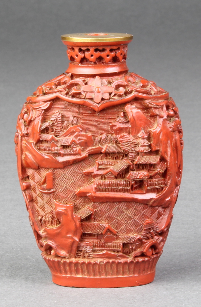 A good 19th Century carved cinnabar lacquer flattened baluster scent bottle decorated with an extensive landscape view with pavilions, seal mark to base 2 3/4"