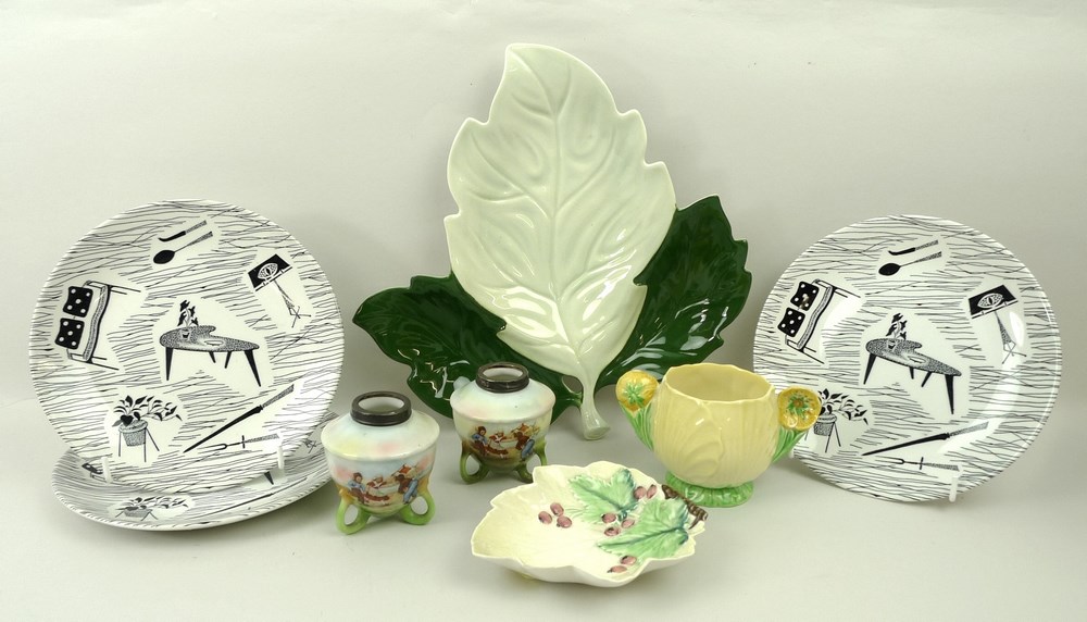 8cm, and three Carltonware pieces, comprising a Buttercup sugar bowl, a two tone leaf plate, and another leaf dish, decorated with berries