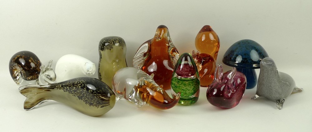 A group of eleven Wedgwood glass paperweights, comprising a polar bear, owl, penguin, seal, rhinoceros, snail, squirrel, rabbit, fish and mushroom, and a further glass paperweight. (11)
