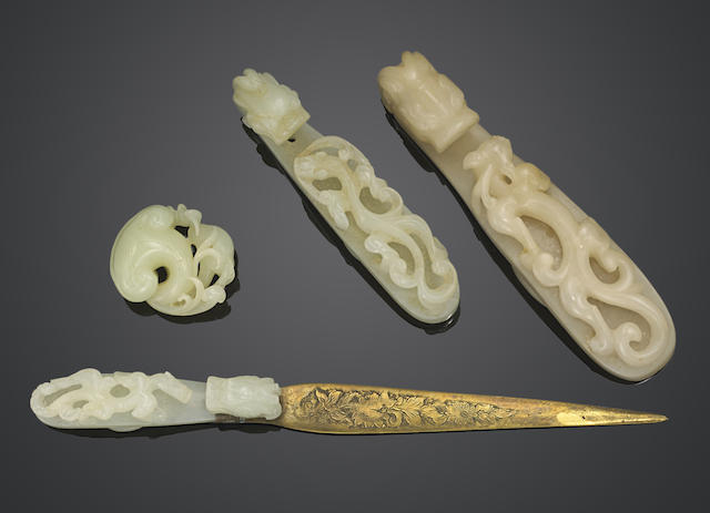 Including three belt hooks of similar curved shape terminating in dragon heads peering at undercut chilong lining the curved bodies (one mounted as a letter opener); the fourth an irregularly circular toggle reticulated as a leafy sprig of lingzhi fu