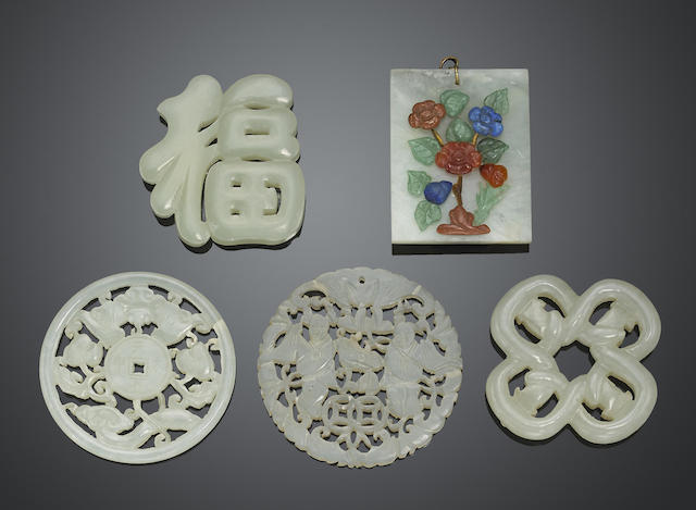 Including two reticulated circular plaques: one decorated with the Hehe Twins surrounded by bats, lotus, and coins, the other centered with an inscribed coin, surrounded by auspicious fruits, a bat, and a ruyi scepter within a carefully rounded frame