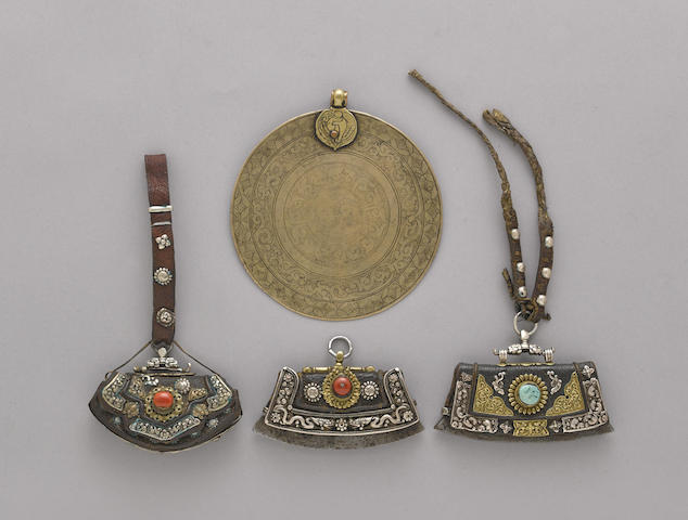 plaques and inset semiprecious stones (wear to leather, losses); the mirror with one side engraved with bands of geometric and floral pattern encircling a yin-yang emblem, with a suspension loop (wear)