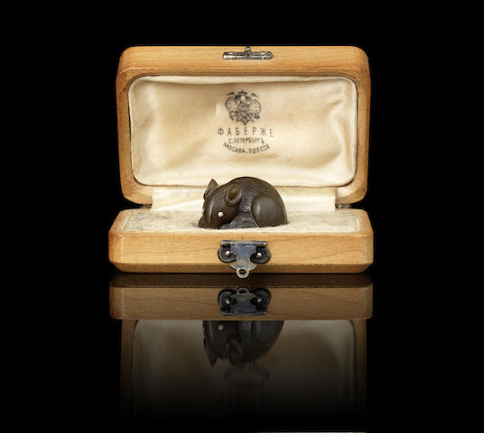 carved of agate, depicted with tail curled around its body, with gold-set old brilliant cut diamond eyes, contained in Fabergé fitted hollywood case stamped St. Petersburg to silk, with ink inscription to underside of box: Lulua Buchanan London 1911