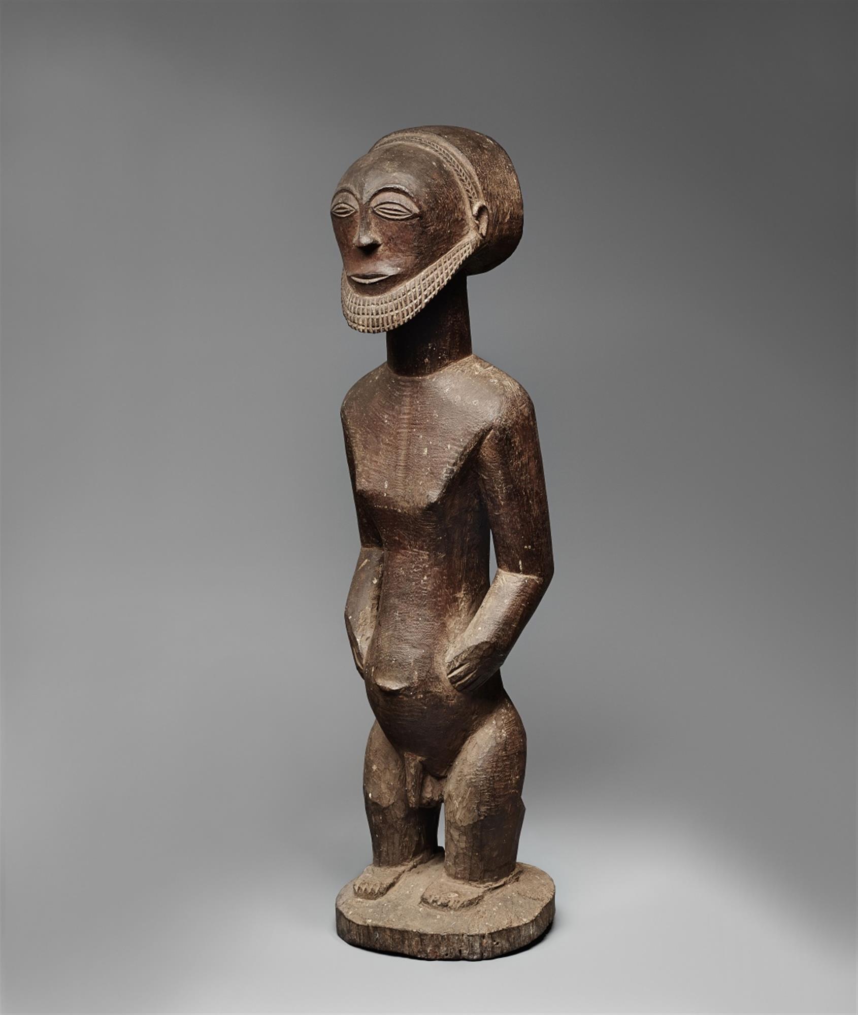 The standing male with hands to the sides of the abdomen, the face with finely carved features and grooved beard, the flat oval coiffure with cruciform motif at the back, dark patina.
