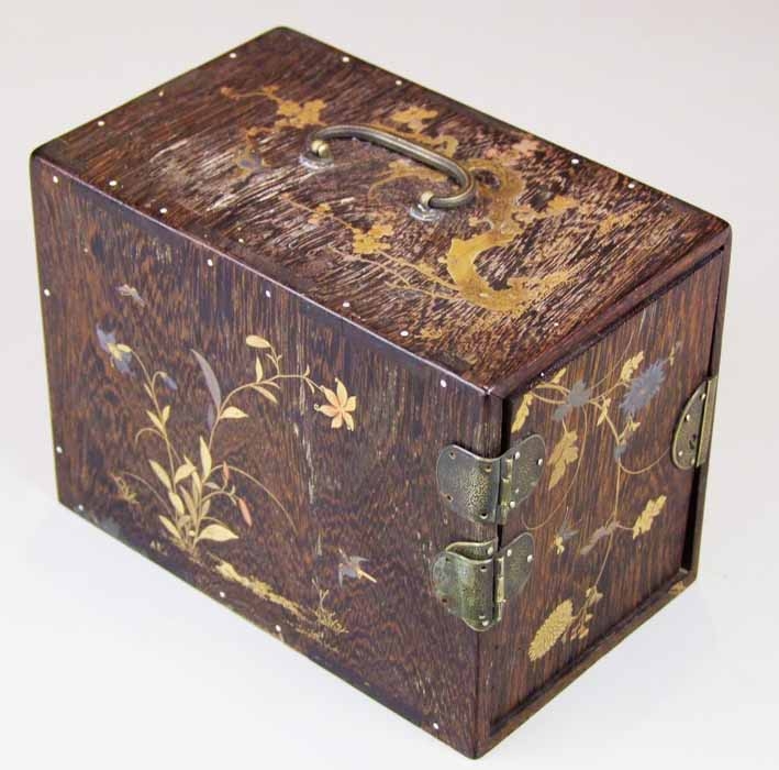 decorated with gilt leaves and birds, enclosed by a door, the interior fitted with three drawers,