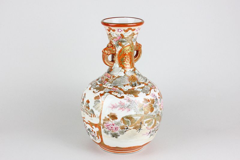 A Japanese porcelain baluster shape vase with rust and gilt decoration around lakeside scenes, character marks to base, 24.5cm high