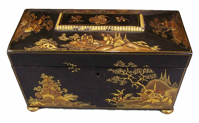 A japanned tea caddy, of sarcophagus form, the interior with three lidded divisions, on bun feet