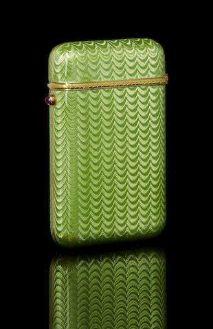 of etui-form, with hinged lid, the body enamelled in translucent lime green over a wavy guilloché ground, the border of the base outlined with chased and engraved gold laurel band, with red hardstone cabochon pushpiece