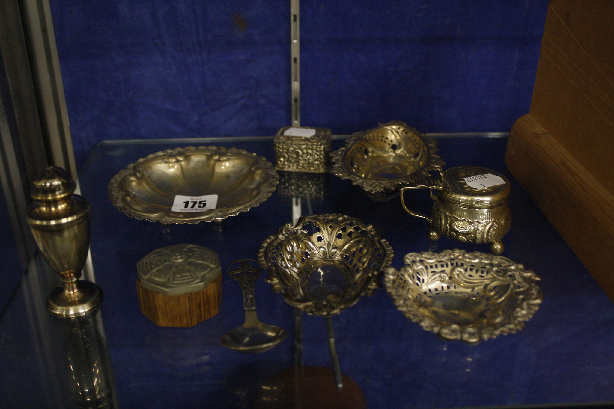 A Johannes Siggaard silver caddy spoon hallmarked Denmark 1950, and a quantity of silver table ware, three bonbon dishes, a small dish, salt cellar, pepper pot and snuff box. 10 troy oz or 316 grams