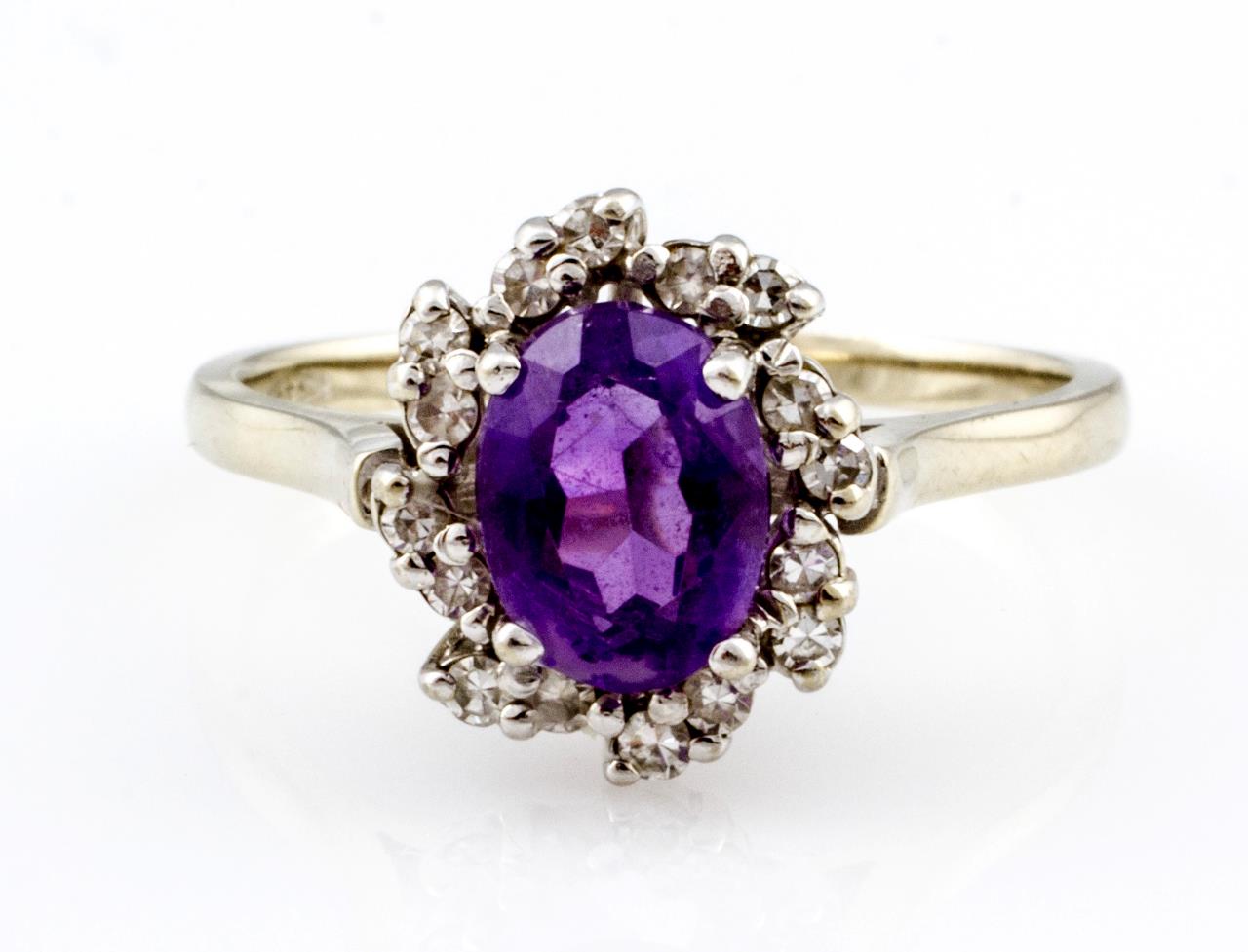 A lady's 14kt white gold amethyst and diamond cluster ring, set with one oval cut amethyst of 1.10 cts
