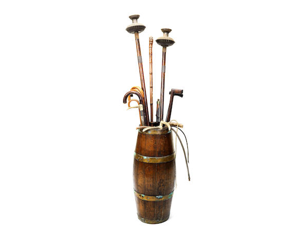 Together with a late Victorian oak coopered stick stand, including two ceremonial torches from Eton used during the Diamond Jubilee in June 1897 and Lord Roberts' Entry into Pretoria on 5th June 1900