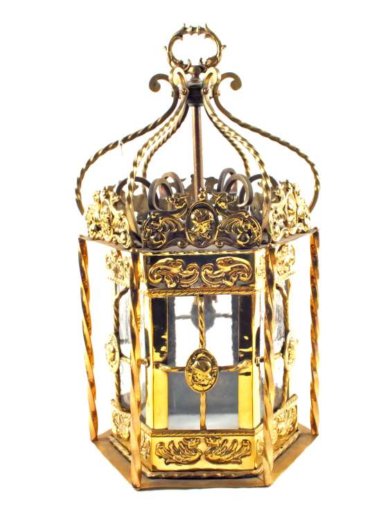 A large decorative 19th Century glazed Brass hall lantern of hexagonal shape