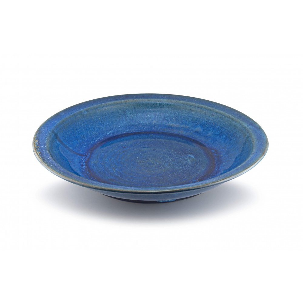 with flattened rim and green-glazed speckles, raised on a low foot, painted Linn Ware, 41cm diameter
