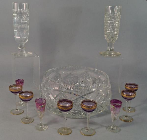 together with two faceted glass cylindrical vases, on pedestal bases, with six purple and gilt drinking glasses and three other loose glasses in a similar taste (12)