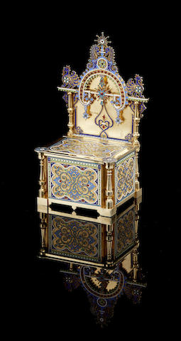 shaped as a throne, hinged lid on a square salt compartment decorated with panels of varicoloured scrolls and stylized cornflowers against stippled ground, upright back with shaped columns, elaborate perforated panel with heraldic roosters on ends, s