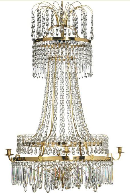 A large Swedish gilt brass and gilt, cut glass six light chandelier
