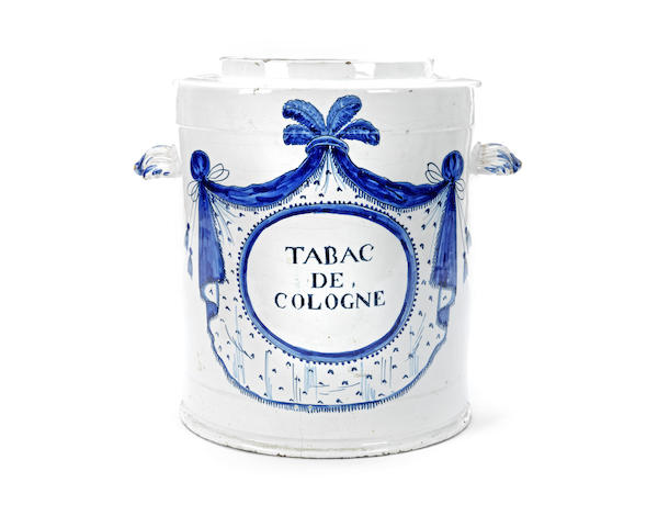the tobacco jar of cylindrical form with foliate handles, the front with stencilled blue oval inscribed TABAC DE COLOGNE within a blue painted faux drapery border, lacking cover, the plates with floral decoration, the plates as found