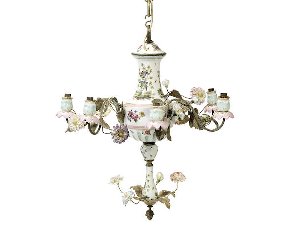 A late 19th century Continental gilt metal mounted and flower encrusted Dresden porcelain six light chandelier, late 19th century