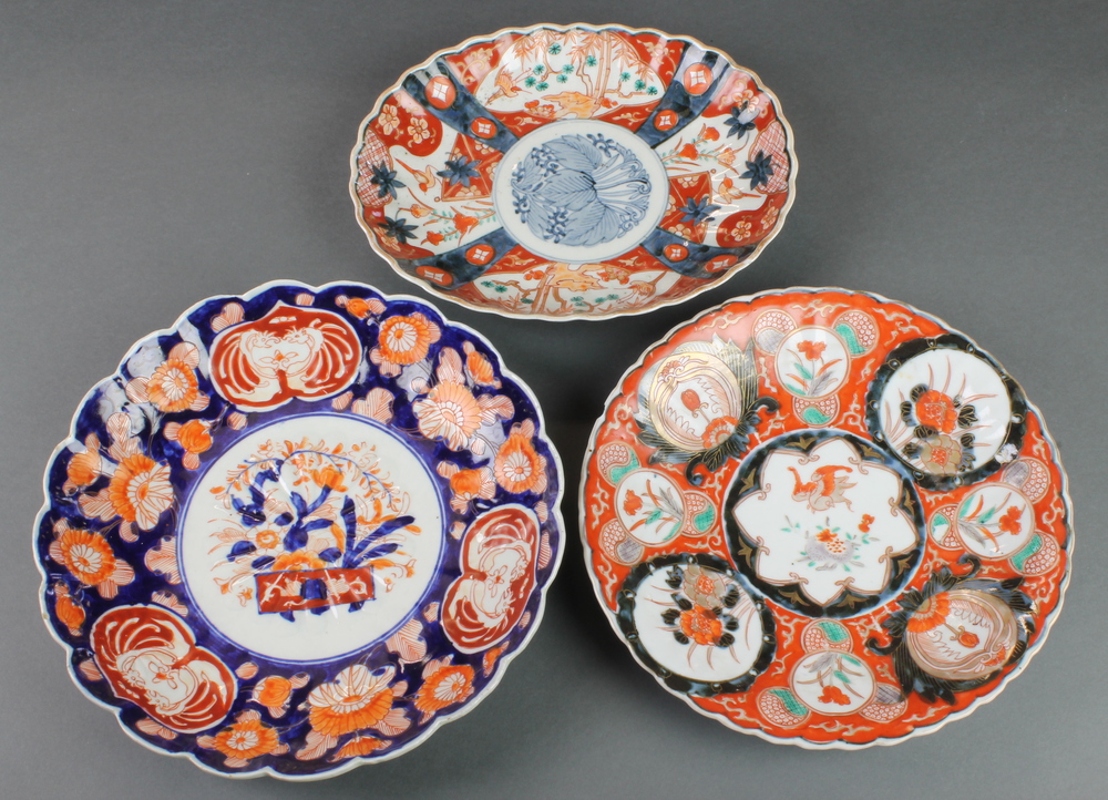 A late 19th Century Imari scalloped oval dish decorated with panels of flowers 9 1/2", 2 others