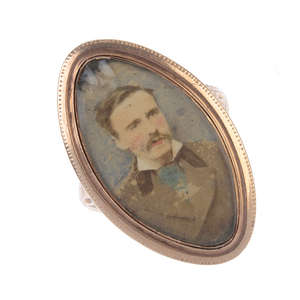 Of marquise-shape outline, the later miniature portrait, within a textured border and sides. Chip to glass. Length 3.1cms. Ring size T. Weight 7.4gms