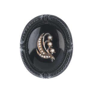 Of oval outline, the outer edge with carved rope-twist detail and a central applied floral design, set with seed pearls. Length 4.7cms. Weight 16.7gms. With associated case.