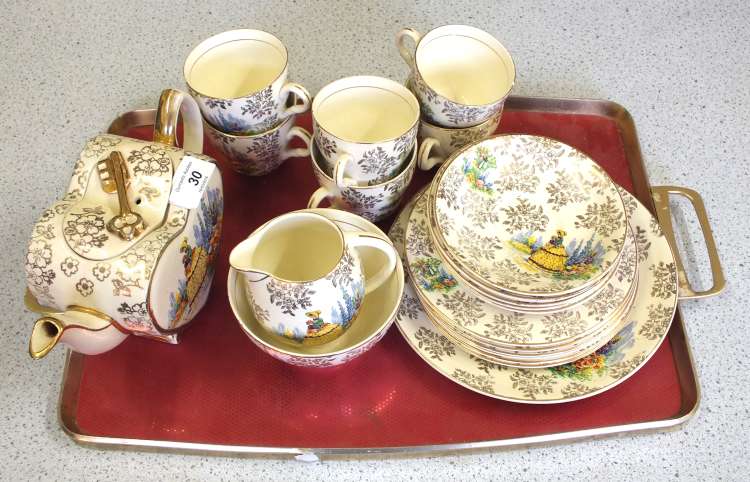 A Lingard Webster crinoline lady tea set with heart shaped teapot