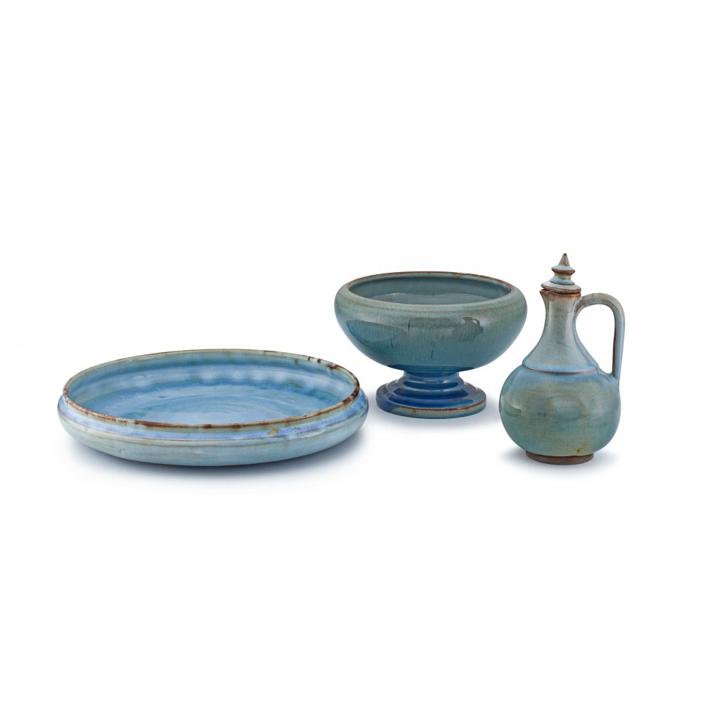 with brown highlights to the rim, raised on a low foot, painted Linn Ware, impressed dish and cover mark, 25cm diameter; a Linn Ware blue-glazed condiment jug and cover, baluster, with loop handle, spire-shaped finial, painted LW, 17cm high; and a Li