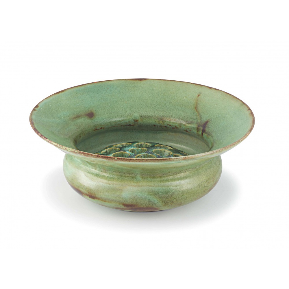 with flared brown-glazed rim, chips, repair, impressed dish and cover mark, 26cm diameter; and a Linn Ware deep green-glazed rose, circular, chips, repair, 15cm diameter