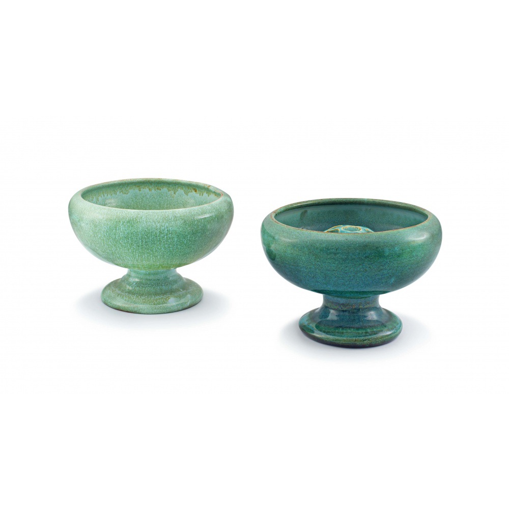 the rim with stippled brown highlights, raised on a folded foot, hairline crack, LW impressed circle, 12cm high; an associated green-glazed rose, chips, 9,3cm diameter; and a Linn Ware pale celadon-glazed pedestal vase, with folded foot, LW impressed