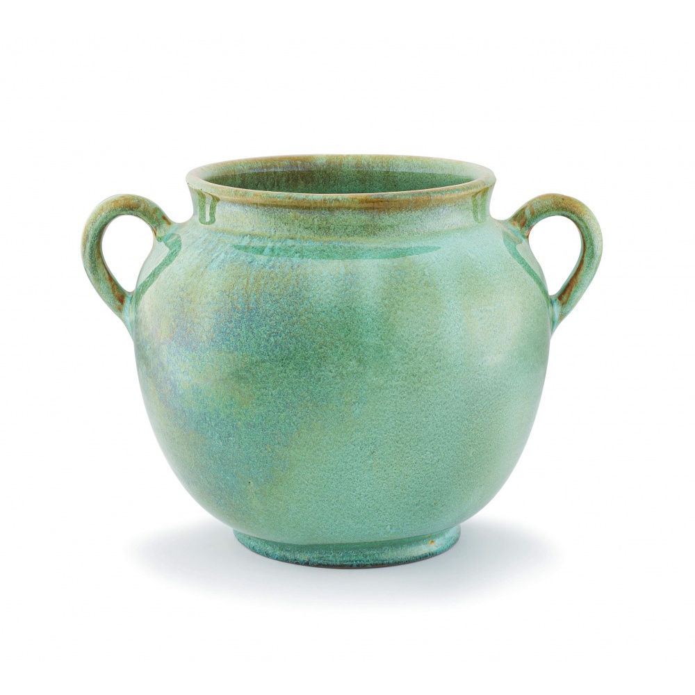 ovoid, the shoulders applied with loop handles, painted Linn Ware, 24cm wide over handles