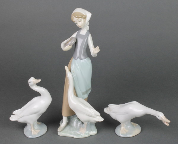 stamped E14JU 9" together with 2 Lladro geese 1 stamped A20 5" and 7"