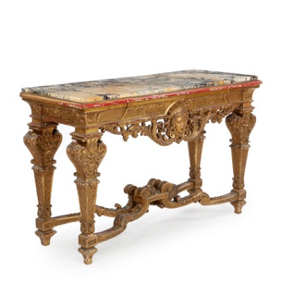 A Louis XIV style giltwood console table with marble top. C. Mellier & Co., London. Ca. 1880. H. 95 cm. W. 154 cm. D. 59 cm.