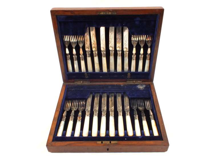 A Mahogany canteen of twenty four Silver plated and Mother of Pearl tea knives and forks