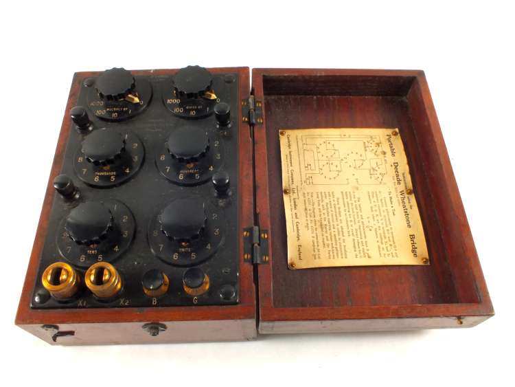 A Mahogany cased portable Decade Wheatstone bridge