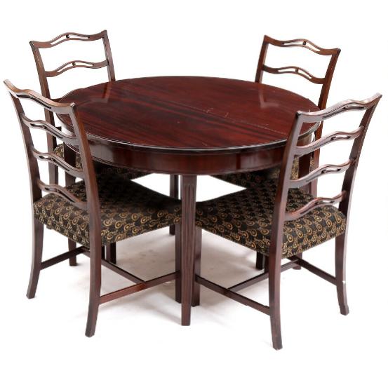 A mahogany dining room comprising a round table with one extra leaf and four chairs