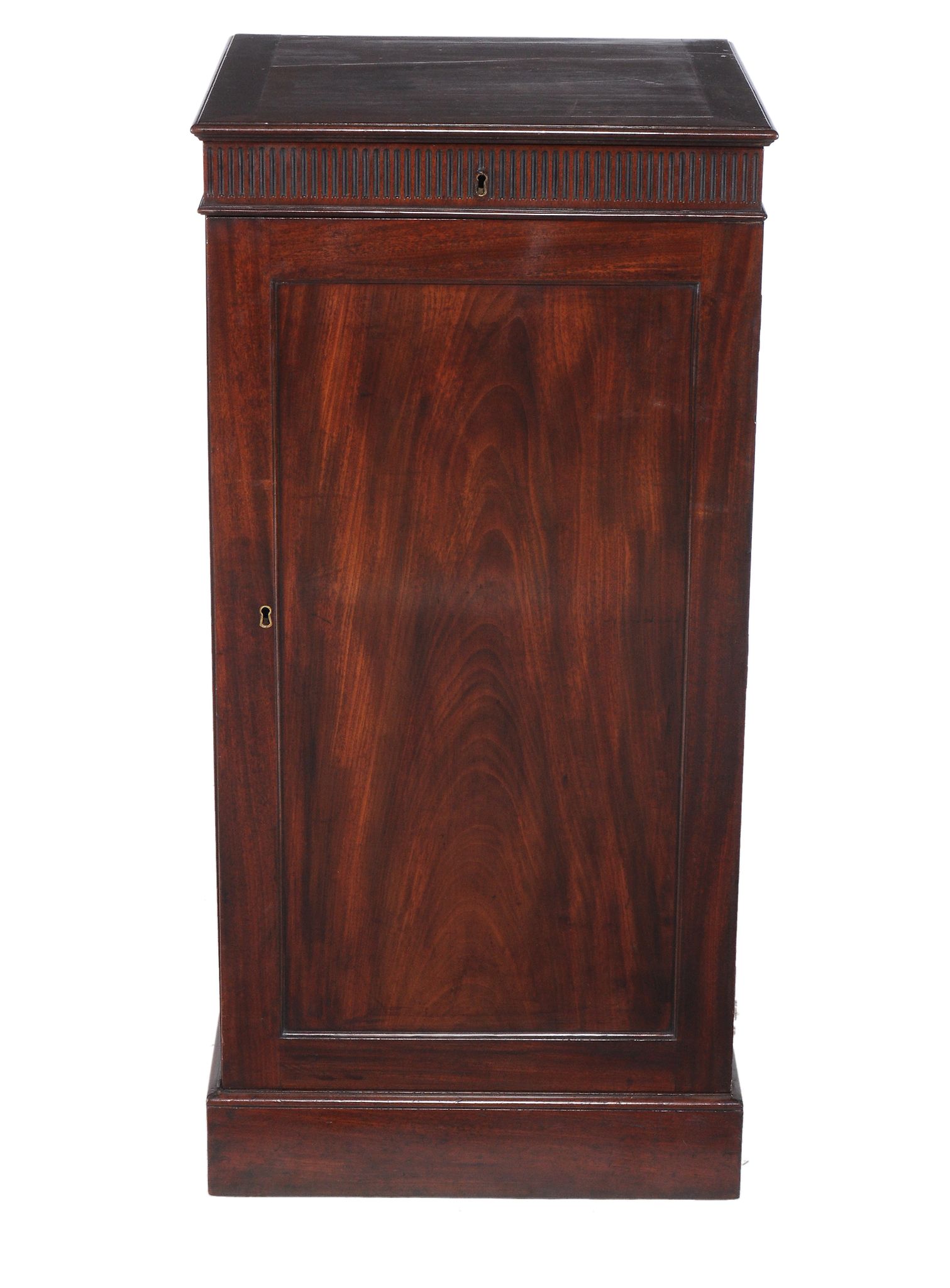 the lift top compartment with fluted frieze above panel door enclosing three shelves and on plinth base