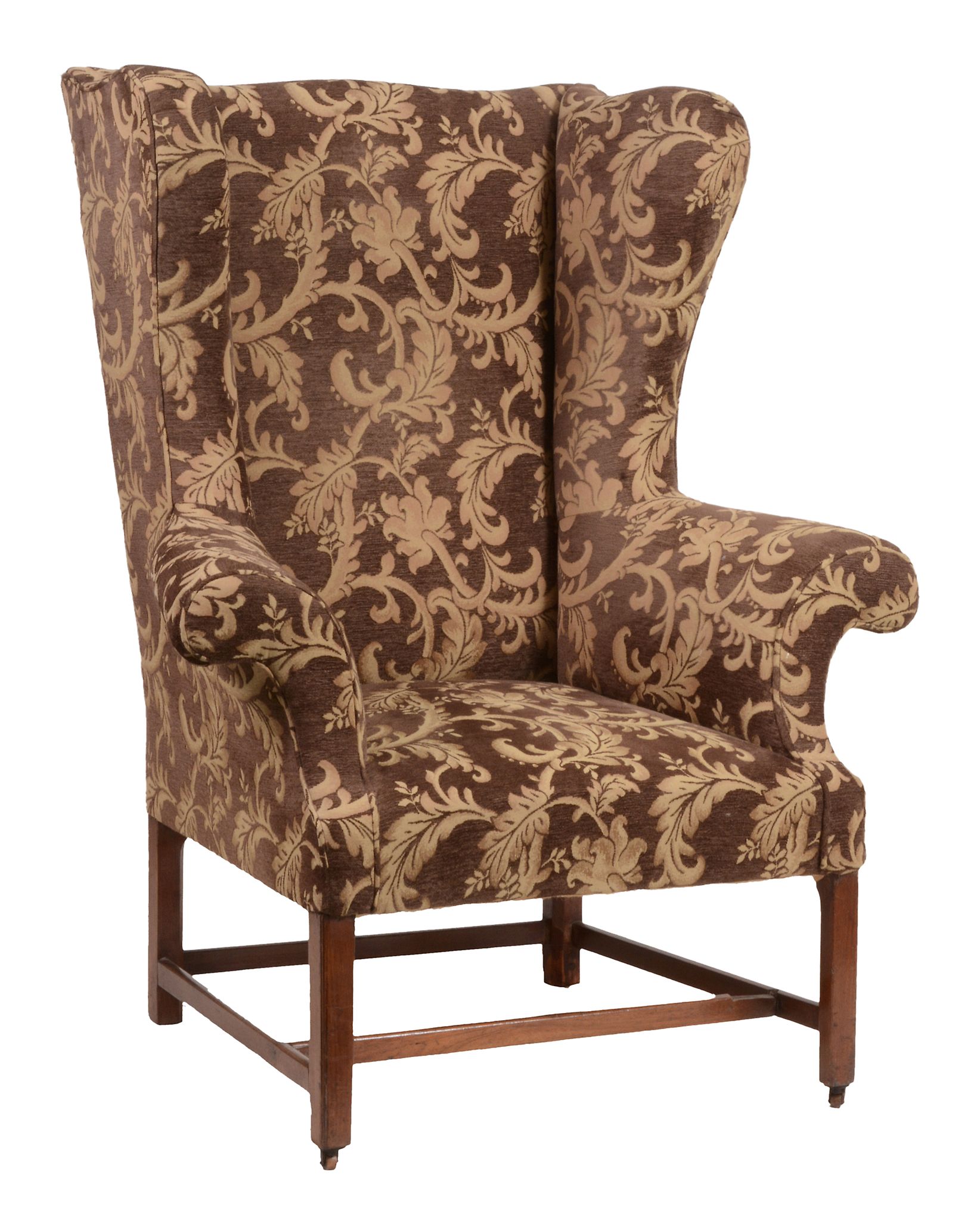 recently reupholstered, with outswept scroll arms above overstuffed seat and champfered square section legs joined by stretchers and on wooden castors