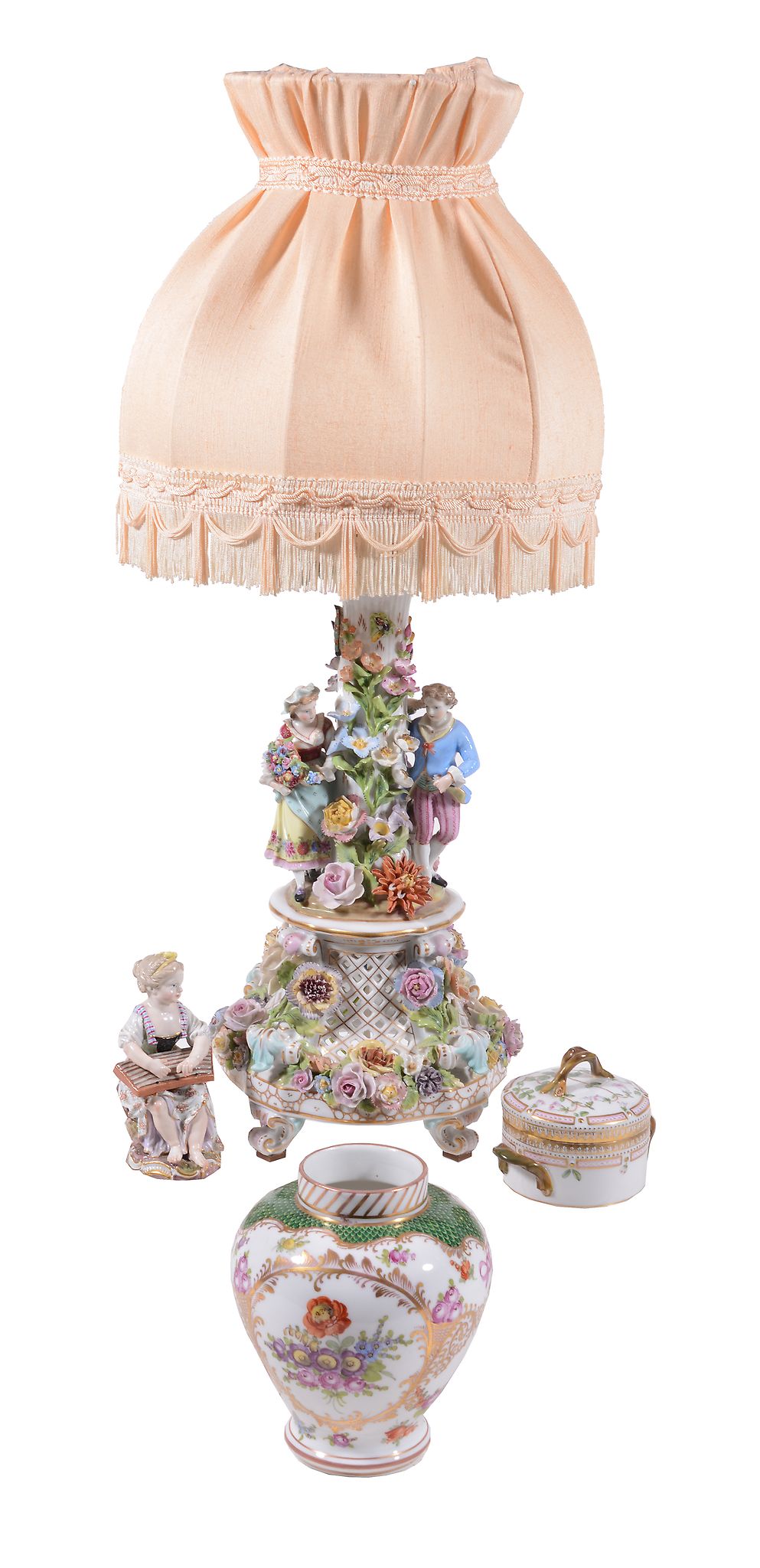 blue crossed swords marks, incised 2559 ; a modern Royal Copenhagen Flora Danica circular box and cover , 1985-1991 , 11cm wide; a Dresden vase and a Dresden figural lamp base