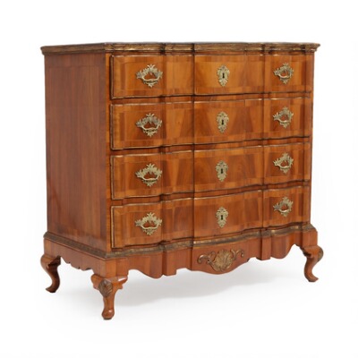 A mid 18th century Rococo giltwood walnut chest of drawers, curved bracket front with four drawers, bronze mountings. H. 112. W. 115. D. 59 cm.