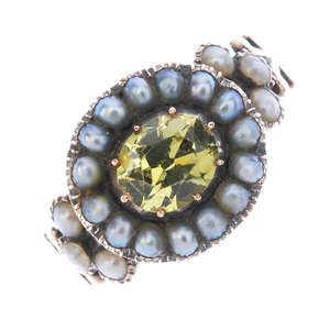 The centrally mounted gold chrysoberyl to the split pearl surround, and further split pearl and foliate shoulders. Weight 2.8gms.