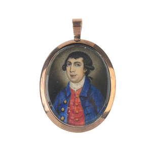 Attributed to Thomas Rosmond, of oval outline, to one side a glazed panel beneath which is a portrait of a gentleman in a blue dress coat, to the reverse a woven hair panel with applied split pearls creating the letters 'MM'. Length 5.2cms. Weight 11
