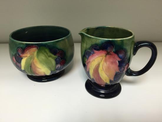 A Moorcroft leaves and berries pattern milk jug and sugar basin