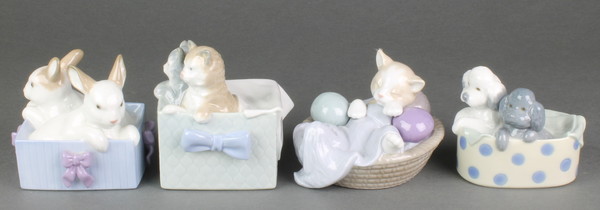 A Nao group of 2 kittens in a box 4", ditto of a cat in a basket 5", a ditto of 2 rabbits in a box 3" and 2 puppies in a box 3"