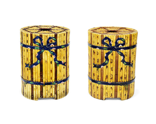 with ribbon banded bamboo moulded decoration, enamelled in shades of blue, green, pink, brown and ochre, with restorations and old repairs