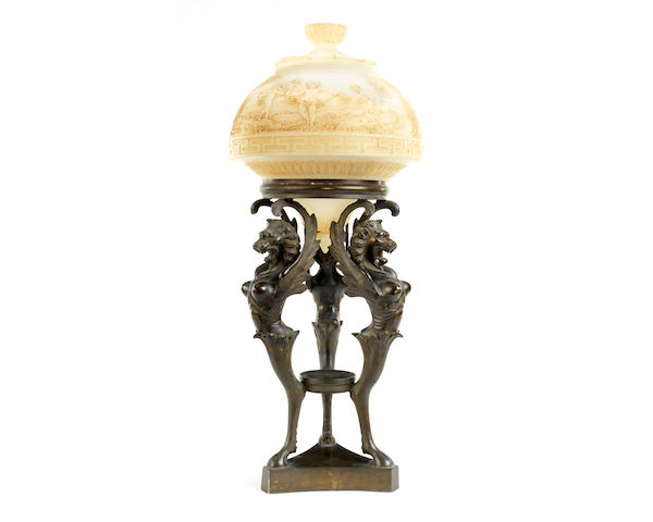 A Neo-Grec style bronze lamp base with carved alabaster shade