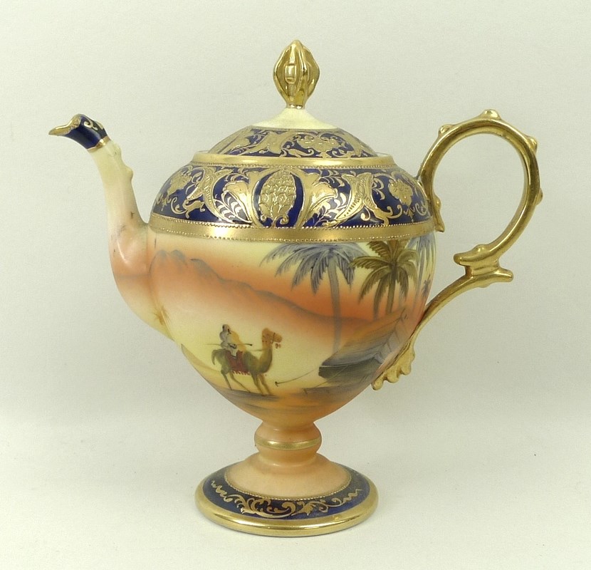 with hand painted decoration of the Nile and desert scenes, comprising an urn shaped tea pot, sugar bowl, milk jug, and four cups and saucers, together with a Noritake covered bowl