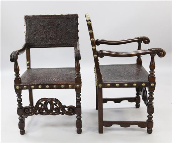 A pair of 17th century Spanish style stained and carved beech elbow chairs, with embossed leather backs and seats