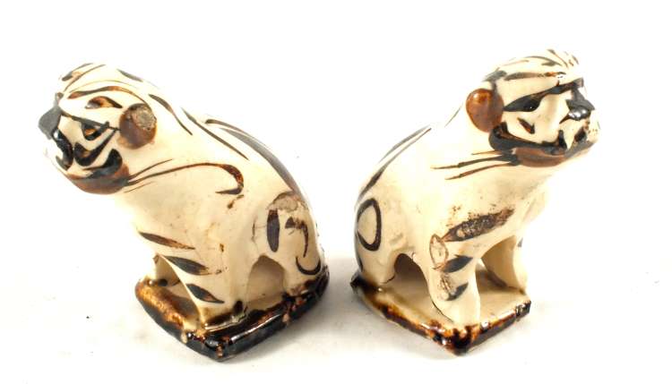 A pair of 18th Century cream and brown glazed pottery Pug dogs (one chipped base)