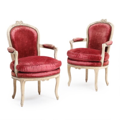 A pair of 18th century white painted Rococo armchairs, carved with bows, cabriole legs. (2)